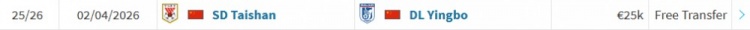 德转显示泰山球员毕津浩已加盟大连英博,方式为自由转会