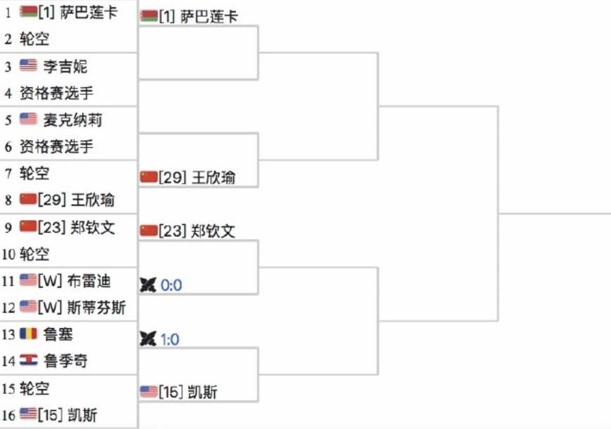 首轮比赛,郑钦文轮空,另一位中国金花王欣瑜同样首轮轮空。第二轮,郑钦文将将会对阵布雷迪和斯蒂芬斯之间的胜者。第三轮,郑钦文则将有望对阵凯斯。若能顺利闯入8强,郑钦文就会在1/4决赛中对阵大魔王萨巴伦卡